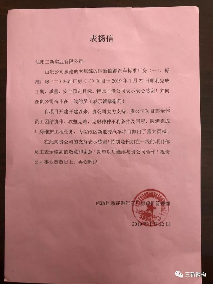 項(xiàng)目經(jīng)理邢玉寶代表工程項(xiàng)目部作太原項(xiàng)目總結(jié)報(bào)告。2018年,在公司上下鼎力支持下,工程項(xiàng)目部發(fā)揚(yáng)打硬仗能吃苦的精神,克服任務(wù)重、工期緊、要求高等困難,圓滿高質(zhì)量按工期完成任務(wù),在工程施工技術(shù)管理方面取得可喜的進(jìn)步和成績,受到山西綜改區(qū)新能源汽車項(xiàng)目管理部的好評,并致感謝信。