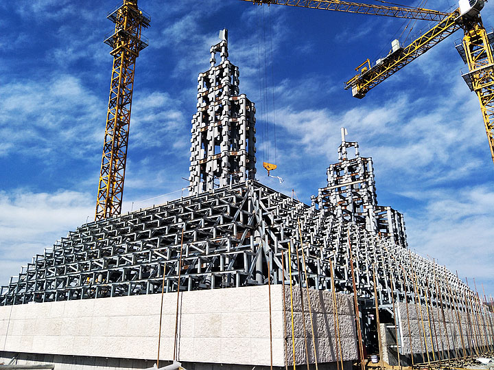 黃帝問道大項目是“帝師之鄉(xiāng)”汝州的重點大型城雕項目,也是當?shù)氐貥诵越ㄖ?。該項目肩負著弘揚汝州歷史文化和華夏文明的重任,承載了太多榮耀和希冀。雕像基底面積1400平方米,人像總高度59.8米,主體結構采用圓管鋼框架,外側采用干掛石材雕塑,總用鋼量2300噸,設計使用年限為100年。雕塑內(nèi)部水、電、消防配套齊全。要用鋼結構、石塑傳神地塑造中華民族敬為人皇的黃帝雕像,不失神韻和靈氣,其難度可想而知。三新不負重托,攻克所有的技術難題,把大師畫卷中的意象用建筑語言完美呈現(xiàn),體現(xiàn)了三新建筑技術與藝術完美融合的建筑理念。施工過程中汝州市政府各級領導多次到現(xiàn)場檢查指導,對工程質量贊賞有加。我們一起見證了精品的煉成,其中凝聚了三新人的心血和智慧,更體現(xiàn)了三新的創(chuàng)新精神。如今被評為“中國鋼結構金獎”工程,更是實至名歸。三新帶您一睹黃帝風采,領略華夏文明。