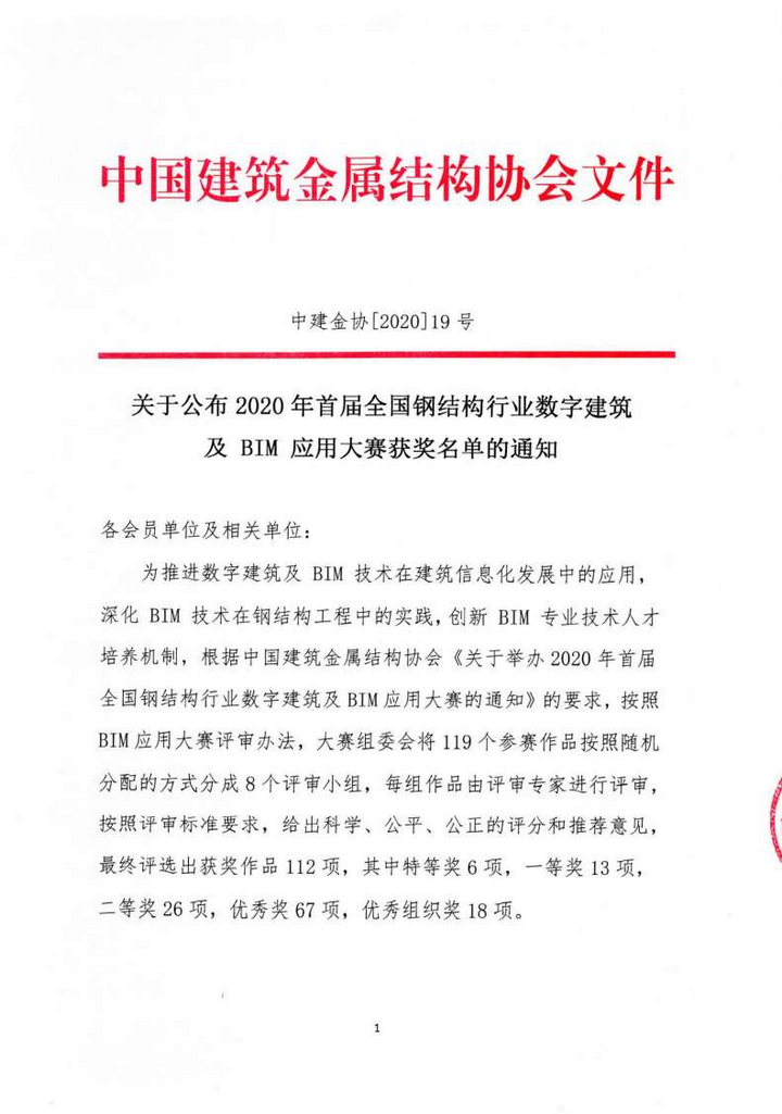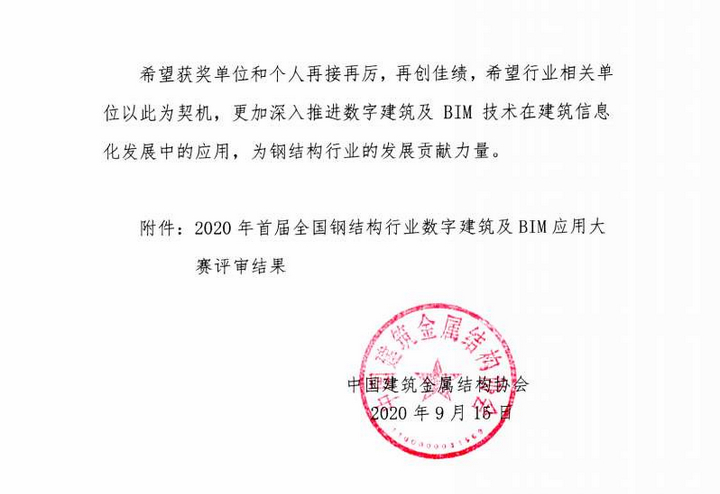 本次大賽由中國建筑金屬結(jié)構(gòu)協(xié)會鋼結(jié)構(gòu)分會承辦,旨在推進(jìn)數(shù)字建筑及BIM技術(shù)在建筑信息化發(fā)展中的應(yīng)用,深化BIM技術(shù)在鋼結(jié)構(gòu)工程中的實踐,創(chuàng)新BIM專業(yè)技術(shù)人才培養(yǎng)機制。大賽對于提高我國建筑業(yè)建筑信息模型技術(shù)的應(yīng)用水平,實現(xiàn)真正意義上轉(zhuǎn)型升級,提升工程質(zhì)量和效率、降低造價和節(jié)約資源,推動技術(shù)創(chuàng)新、質(zhì)量創(chuàng)優(yōu)和人才隊伍建設(shè)有著積極的推進(jìn)作用。同時相信隨著BIM應(yīng)用的進(jìn)一步展開,我公司的裝配式建筑發(fā)展將如虎添翼,我司 BIM團(tuán)隊會取得更加優(yōu)異的成績!