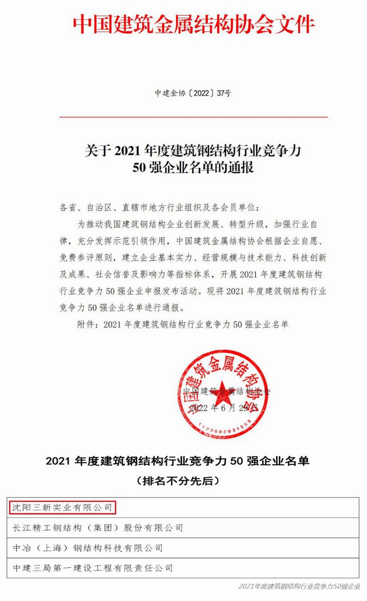 熱烈祝賀三新集團(tuán)榮獲“2021年度建筑金屬屋(墻)面行業(yè)企業(yè)綜合競(jìng)爭(zhēng)力10強(qiáng)企業(yè)”等多項(xiàng)殊榮!