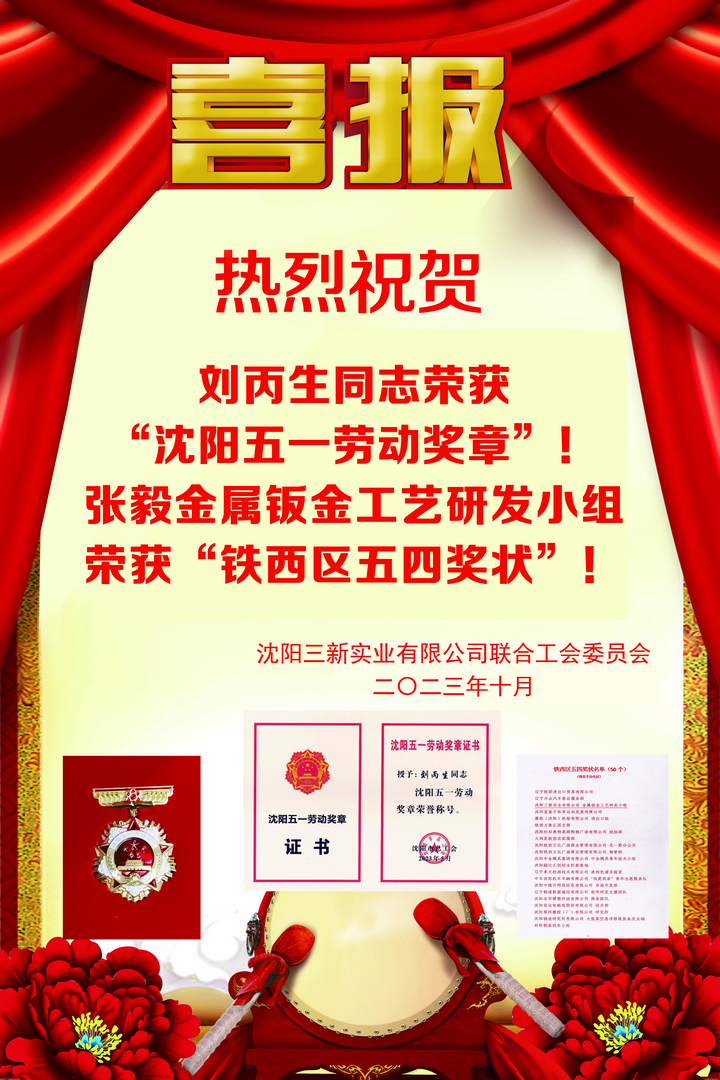 熱烈祝賀 劉丙生同志榮獲“沈陽五一勞動獎?wù)隆保?張毅金屬鈑金工藝研發(fā)小組榮獲“鐵西區(qū)五四獎狀”!