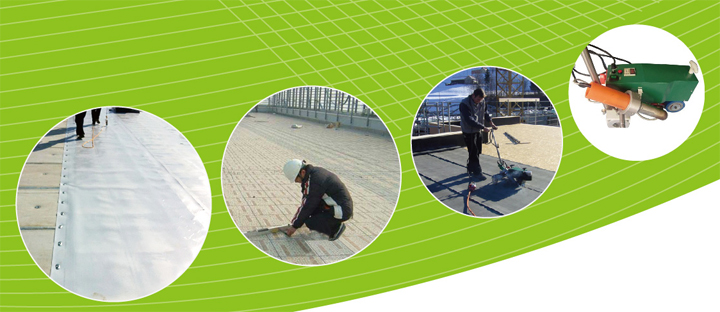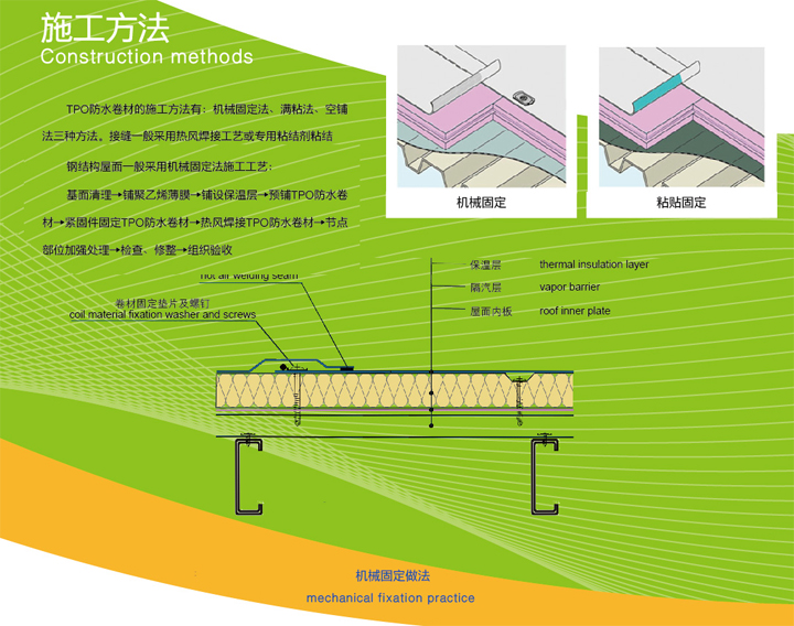 為確保卷材防水層在屋面的整體性,關(guān)鍵之一是搭接處理,通過熱焊接使相鄰卷材搭接形成高于卷材強(qiáng)度的粘結(jié)層,形成卷材整體的連續(xù)密封防水層。 TPO卷材與屋面的固定方式: